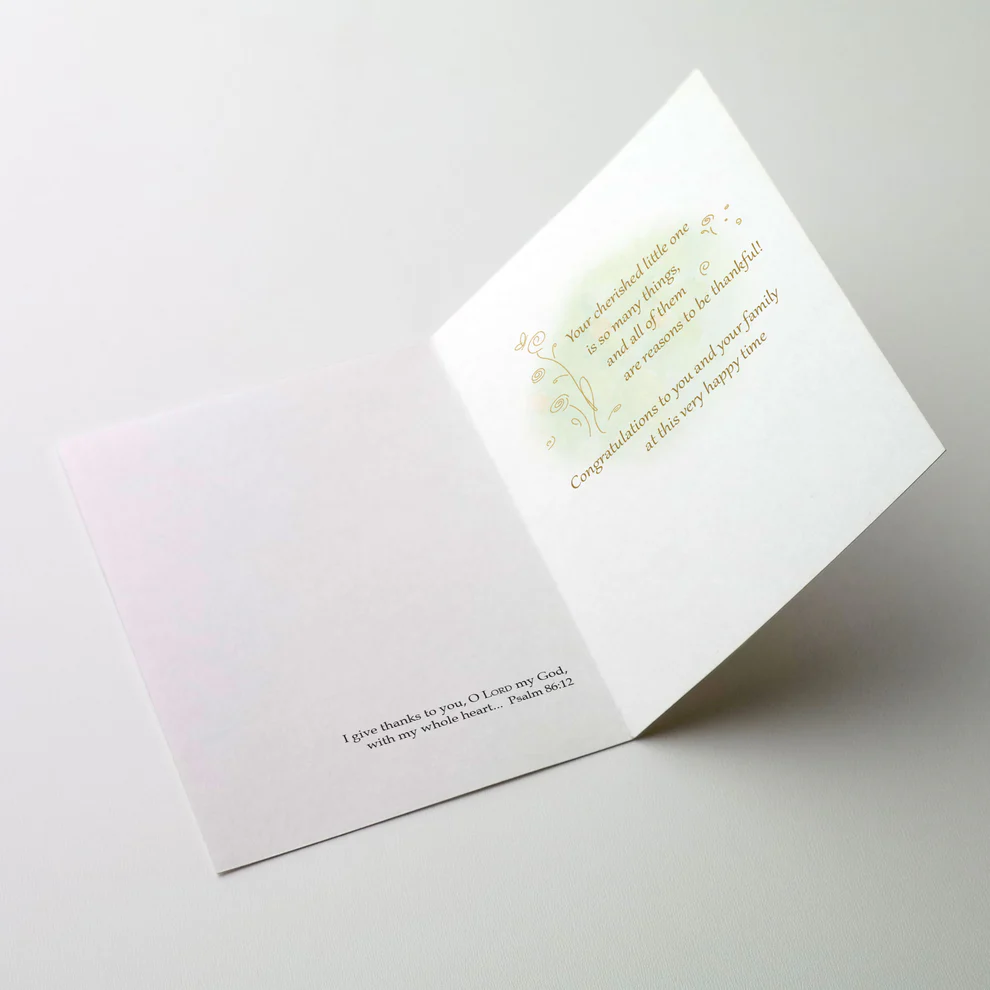 Inside Text: Your cherished little one is so many things, and all of them are reasons to be thankful! Congratulations to you and your family at this very happy time